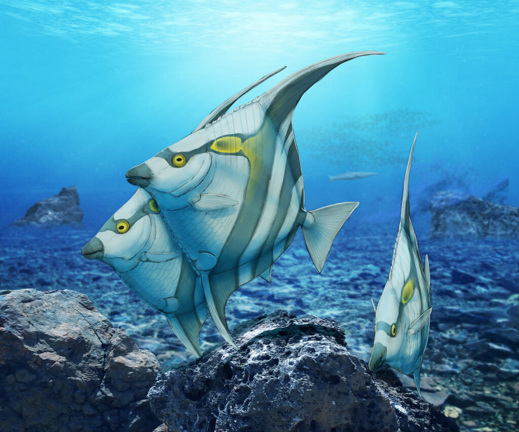 Pycnodont fishes (Pycnodontiformes) are a monophyletic and ecologically successful clade of extinct ray finned fishes with a fossil record spanning nearly 180 million years from the Late Triassic to middle Eocene (Tintori 1981; Poyato-Ariza & Wenz 2002; Kriwet & Schmitz 2005; Voss et al. 2019). They are most commonly associated with shallow water marine habitats but are also found in association with freshwater and estuarine deposits (Longbottom 1984; Poyato-Ariza et al. 1998). A deep, rounded, and laterally compressed body, a frontal flexure of the skull in profile view, and elongated dorsal and anal fins, forming together with the caudal fin an effective rudder characterize pycnodonts (Fig. 1). In their body shape they superficially resemble extant coral reef fishes like butterflyfishes (Chaetodontidae), surgeonfishes (Acanthuridae), and triggerfishes (Balistidae) (Fig. 2). Distinctive characteristics of pycnodonts are their molariform teeth, which generally are arranged in well-defined rows on the unpaired vomer (upper jaw) and paired prearticulars (lower jaws). This dentition represents an adaptation to shelled prey. Their diversity is strikingly high, with over >600 nominal species in >80 genera of which many taxa are based on teeth and dentitions only (Kriwet, 2001a; 2005). The palaeobiogeography of these fishes suggests they originated in the Tethys Sea initially and then spread worldwide (Kriwet 2001b; Martín-Abad & Poyato-Ariza 2013).